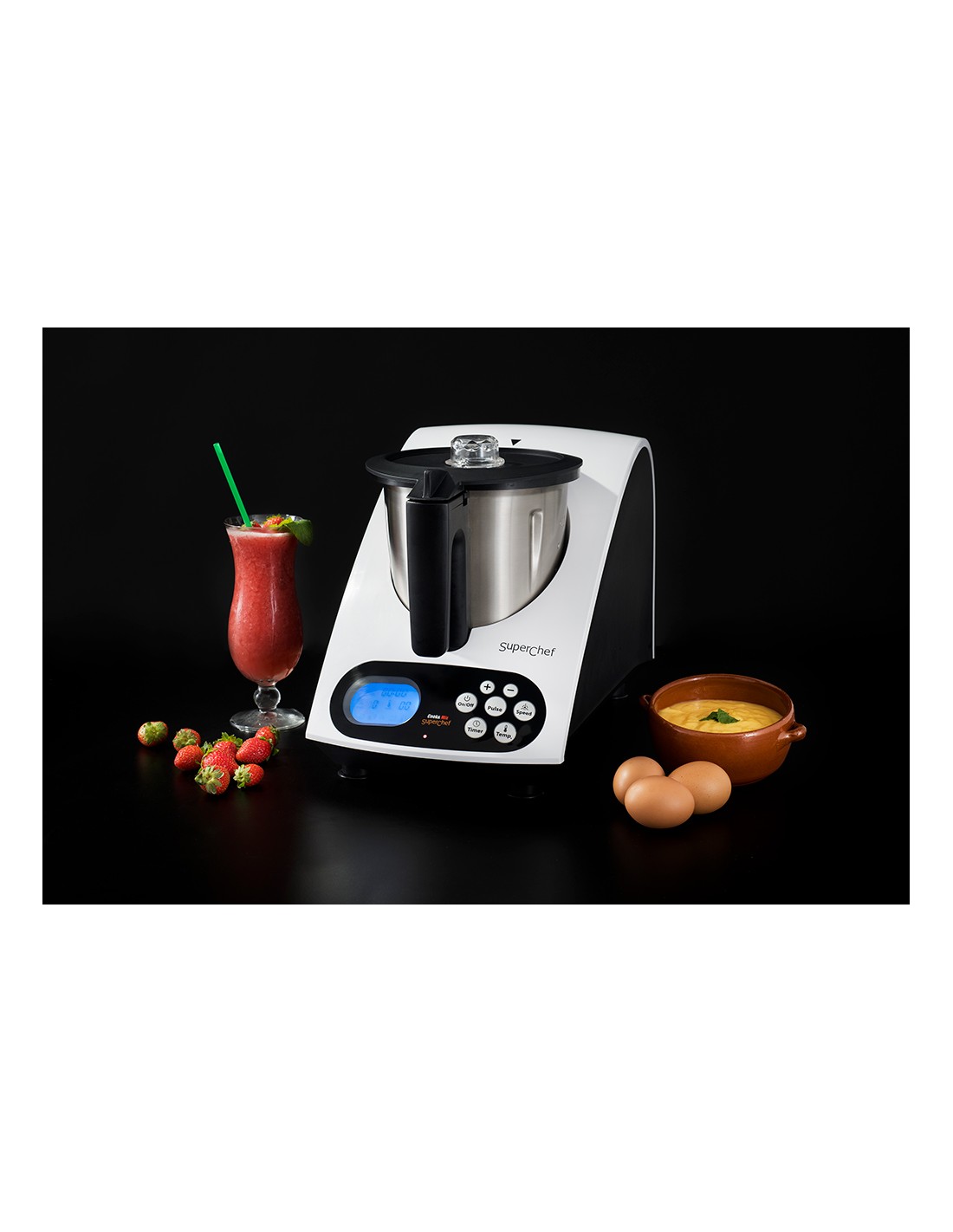 SuperChef может готовит, нагревать, обжаривать, кипятить, готовить на пару, перемешивать, смешивать, замесить, делаем любые эмульсии, измельчить, взбить, измельчить лёд, орехи, кофе и многое другое делает сам за считанные секунды и минуты.